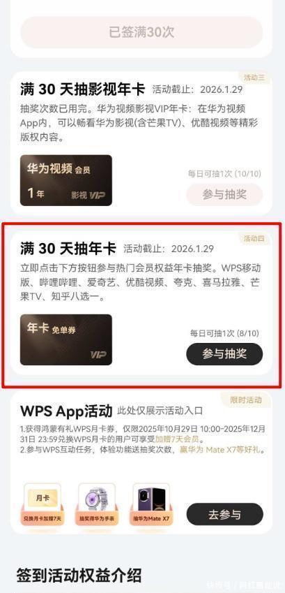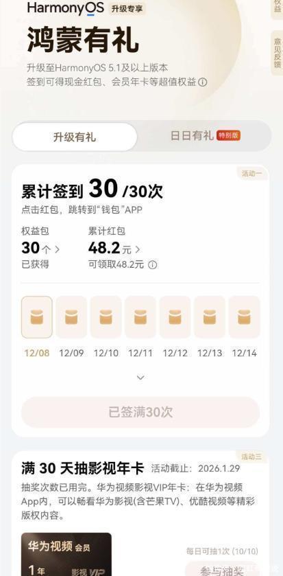 除了这个压轴大奖,平时的福利也不少。比如签到抽奖,每天签到就能领现金红包或者随机权益,随手点一下的事儿,比如每天领一天的华为视频影视会员权益,连续天那就是两个半月,这不也省下不少钱吗?还有首次签到后天起还有机会抽到华为影视会员+优酷小屏会员的组合年卡包,双重快乐更超值。
